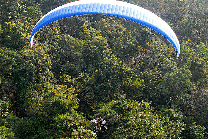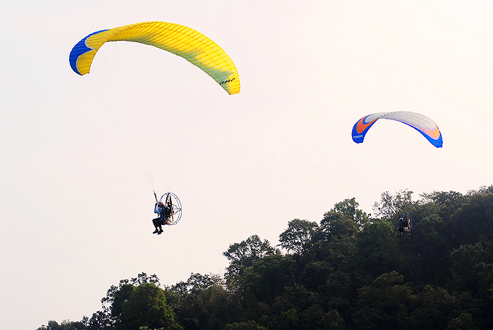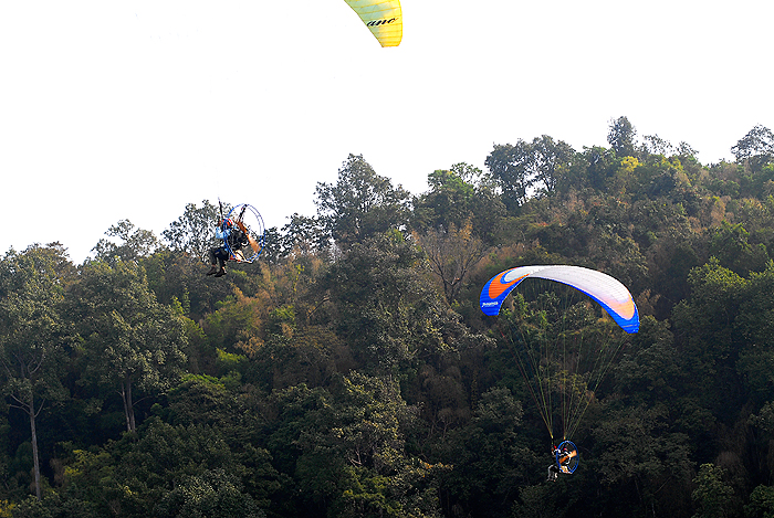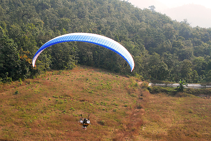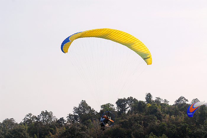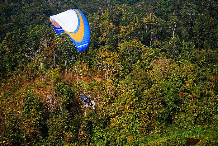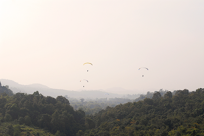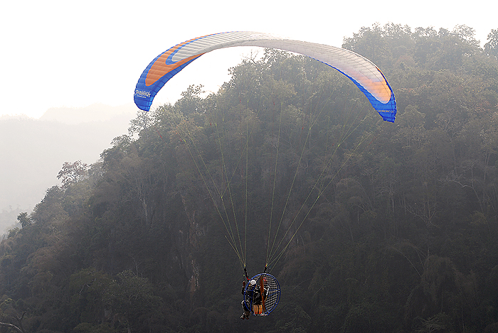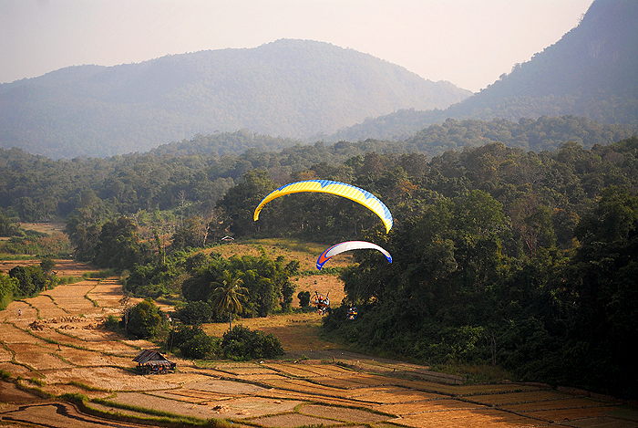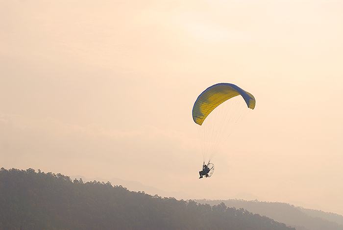 บางช่วงของเส้นทาง ที่แม่ฮ่องสอนทิวทรรศการบินของแต่ละอำเภอไม่เหมือนกันเลยครับ ที่แม่สะเรียงจะเป็นที่ราบกว้างๆแล้วมีลำนำ้ยวมตัดผ่านเราสามารถบินจาก อ.แม่สะเรียงมายัง อ.แม่ลาน้อยได้ครับ รับรองครับว่า"อะดีนาลีน"พุ่งกระฉูดเป็นแน่ครับ ส่วนแม่ลาน้อยก็เป็ฯที่ราบในช่องเขามีพื้นที่ป่าที่ต้องบินข้ามบ้าง ส่วนขุนยวมนี่เหมือนบินอยู่บนภูกระดึงเลยครับ แม่ฮ่องสอนนี่ก็ต่างไปครับมีทั้งป่าและทุ่งนาในหุบเขาแต่ลมภูเขาที่นี่ไม่เบาครับ ร่มผมที่ว่าแน่ๆพับเป็นประจำจนชาชินไปแล้วครับแต่ฤดูนี้เบาหน่อยครับ เพราะพื้นที่บินจะมีเขามากเลยทำให้ มักจะเกินลมหมุนวนหลังเขาบ่อยๆ ที่ปางมะผ้าเป็นเขาหินปูนสูงลิ๊บเลยครับมีพื้นที่ราบซุ๊กอยู่ในซอกเขาจริงๆส่วนปายก็น้อง เอฟ เคยนำบรรยากาศบางส่วนใส่ไปในไทยพารามอเตอร์แล้วครับตอนแก๊งส์ฟรายบอยมาบินอย่างที่เห็นครับที่โล่งๆกว้างๆบรรยากาศดีครับแต่ผู้ประกอบการที่พักที่มีมากมายที่นั่นไม่ชอบร่มบินเอามากๆครับคงจะกลัวพวกเราไปขึ้รดหัวเอา
