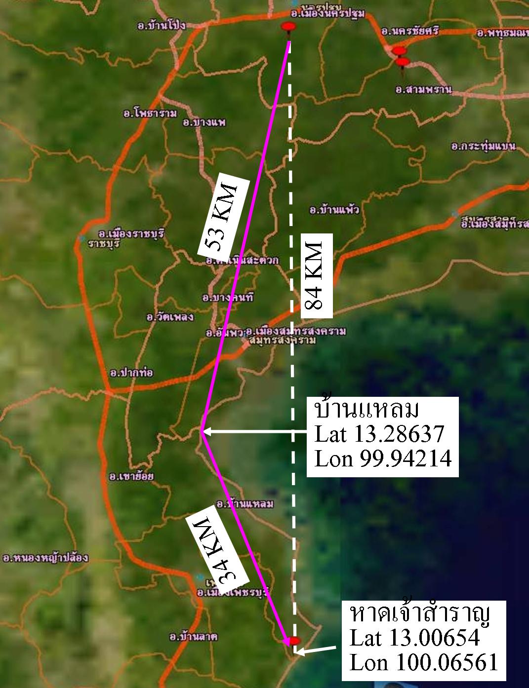 เส้นทางนครปฐม-หาดเจ้าสำราญ ถ้าบินตรง ตามเส้นสีขาว จะลงทะเลนะครับ 84 ก.ม. แต่ถ้าบินไปบ้านแหลม ตามพิกัดที่ให้ แล้วบินตามถนนไปหาดเจ้าฯ ใช้ระยะทางเพิ่มอีกนิดเดียวครับ คือ 87 กม.