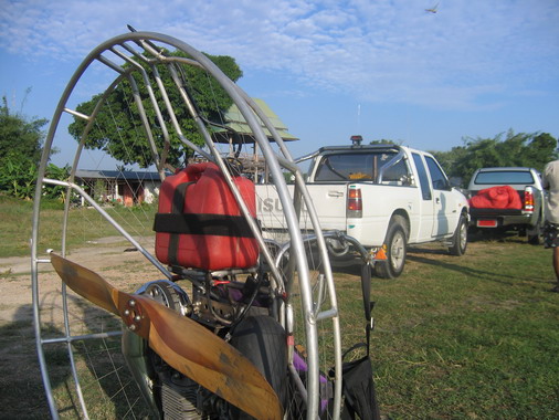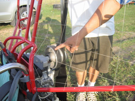 ภาพนี้ถ่ายผ่านเส้นเอ็นถักโกร่งร่มบิน เส้นเอ็นถักเป็นตาราง ป้องกัน สายร่ม มือ ศีรษะ สิ่งของ เสื้อผ้า ฯลฯ ไม่ให้หลุดผ่านเข้าไปโดนใบพัด ป้องกันอันตรายได้ในระดับหนึ่ง....แต่ละสำนักมีวิธีการถักเอ็นโกร่งร่มบินในหลายแบบหลายสไตล์ บางสำนักถักเป็นตาราง บางสำนักถักเป็นแห บางสำนักถักเป็นใยแมงมุม เราเห็นสายเอ็นถัก สามารถบอกได้ว่า เครื่องนี้ มาจากสำนักใด ?