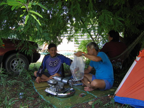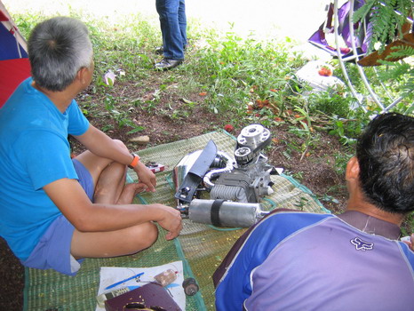 ชมเครื่องคุณต่อกันใกล้ๆครับ คุณต่อมีอยู่สองเครื่อง เครื่องแรกเจอาร์ยกไปกองไว้ที่บ้านเอาไว้ติดเล่นแก้กลุ้มเวลาไม่ได้บิน....ส่วนเครื่องที่สองตัวนี้ ความจุเกือบ 200 ซีซี ลูกสูบนอก คาร์บูเหลี่ยม แต่งเหมือนกับเครื่องของผมทุกอย่าง แต่เรียกรอบได้เฉียบขาดกว่าเครื่องของผม...!@#@!$#@! คุณต่อใช้เครื่องตัวนี้ตัวเดียวตลอด บินตะลุยมาทั่วทุกสารทิศ ไปดูรูปคุณต่อเก่าๆที่เคยส่งมาให้ดูกัน ไม่เคยเสีย ไม่ชอบซ่อม บำรุงตามสภาพ ถ้ารู้ว่าคุณต่อใช้เครื่องยนต์บินอย่างไรแล้ว จะชวนสงสัยเลยว่า มันทนมือทนตี..นคุณต่อมาได้อย่างไร...จนถึงวันนี้ มันน่าจะพังไปนานแล้ว จิงๆๆๆๆๆคับ