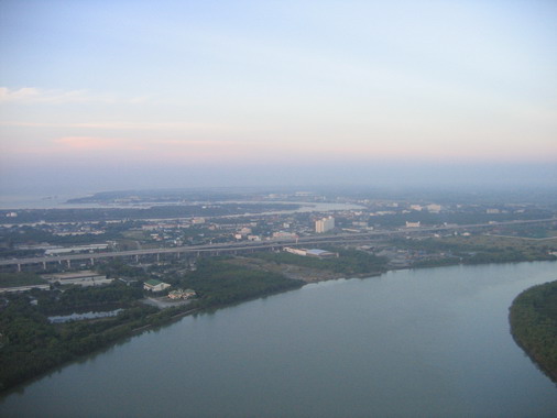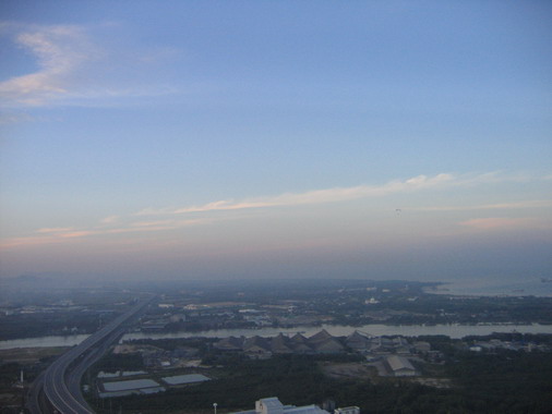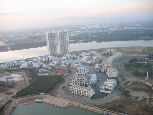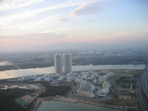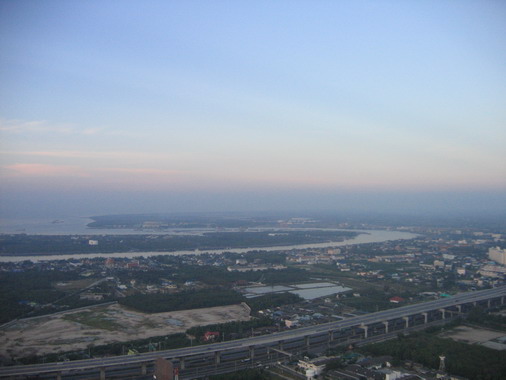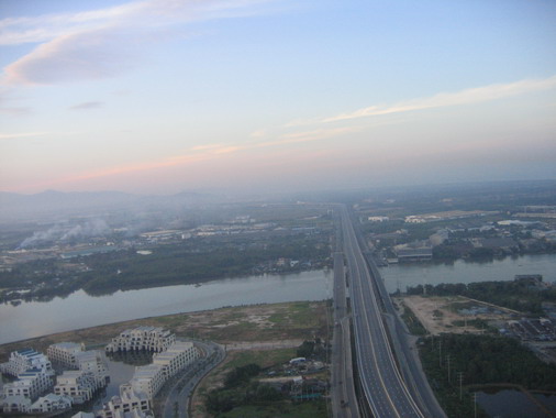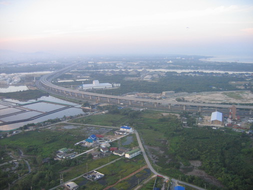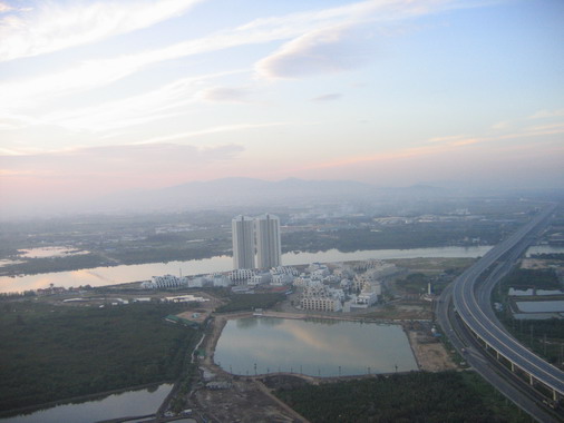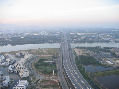 เบื้องหน้าเป็นตึกแท่งสูง 2 ตึกคู่กัน อยู่ริมแม่น้ำบางปะกง ทางด่วน Tollway ทิ้งโค้งหักศอกตรงนี้พอดี ชมภาพ ส่วนเบื้องหลังเป็นแนวเทือกเขาหลายลูกสลับซับซ้อน