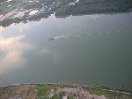 เรือแล่นอยู่กลางแม่น้ำบางปะกง ขณะที่ผมกำลังบินข้าม