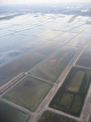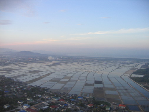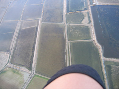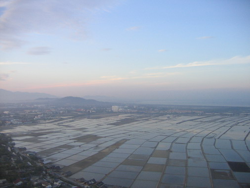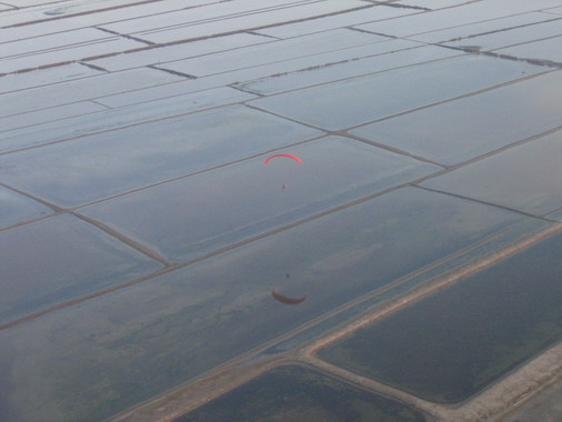 บินอยู่กลางนาเกลือ ด้านขวาเป็นทะเล