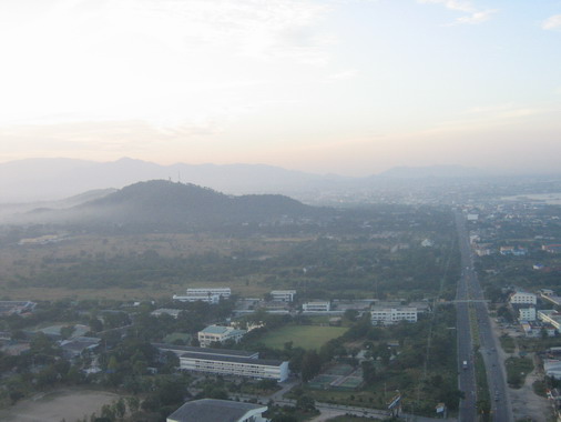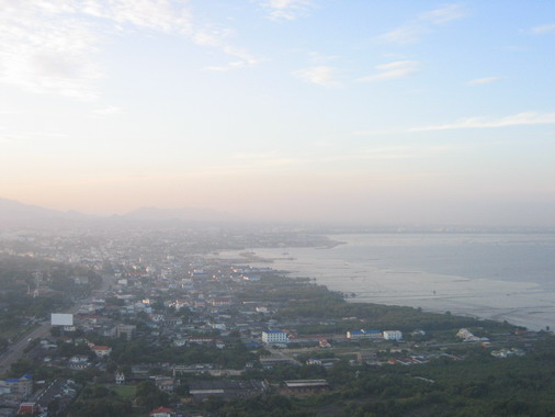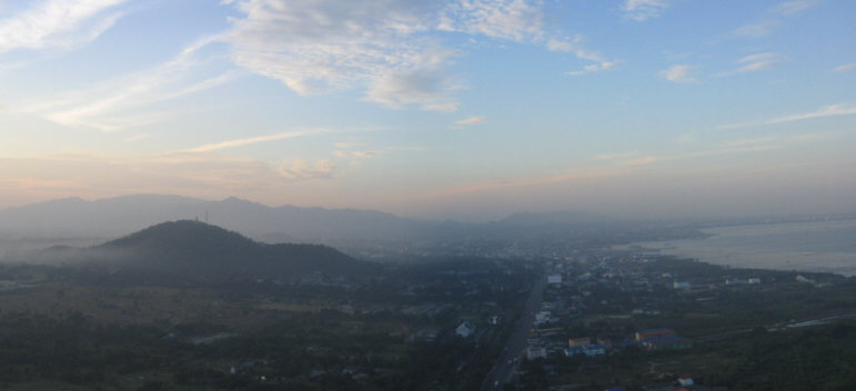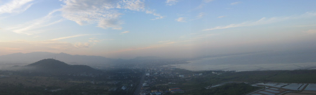 ภาพพาโนราม่า ภูเขาอันเป็นที่ตั้งของค่ายนวมินทราชินี เมืองชลบุรี และ ทะเล