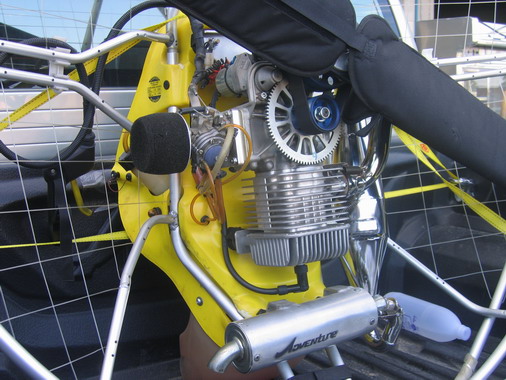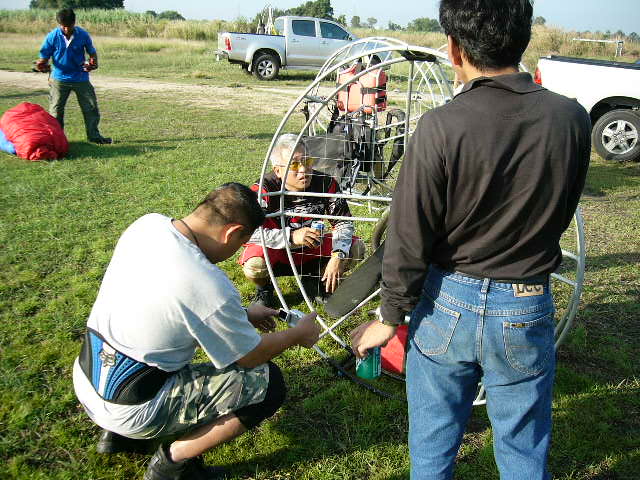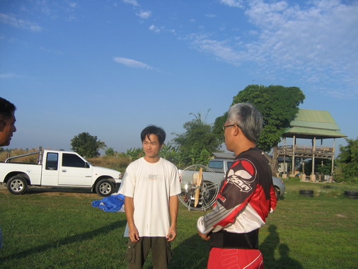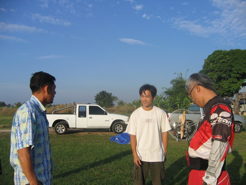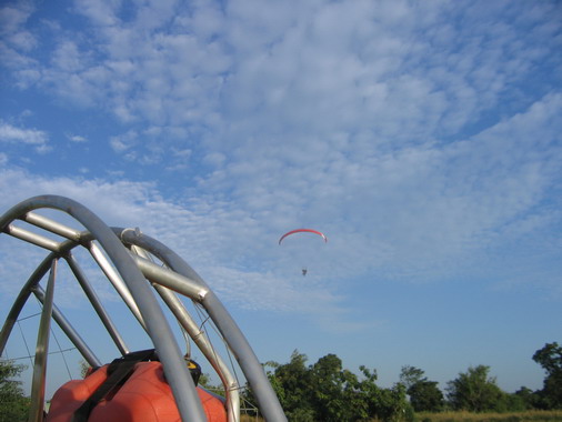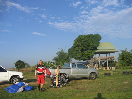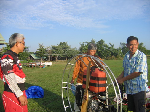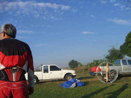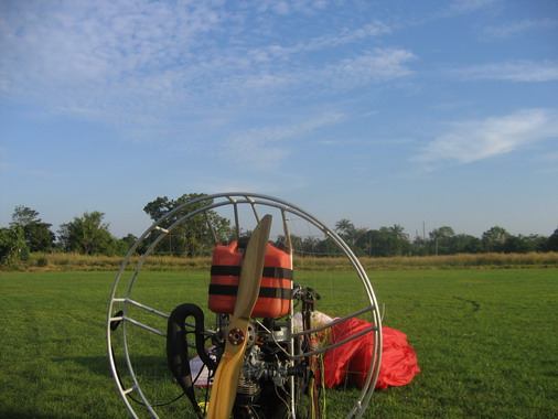 เครื่องไทยขนาด 200 ซีซี ลูกสูบนอก คาร์บูเหลี่ยมแข่ง ถัง 20 ลิตร เมดอินทุยทำ เป็นเครื่องเก่งของผม ที่ใช้ตะลุยบินมาคุ้มค่าราคาของมันแล้วครับ ส่วนร่มที่กองอยู่ เป็นร่ม Nova สมรรถนะเยี่ยมครับ