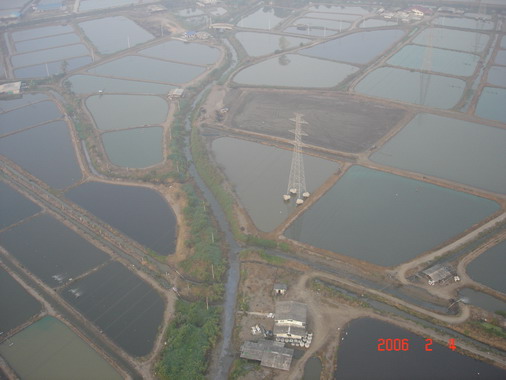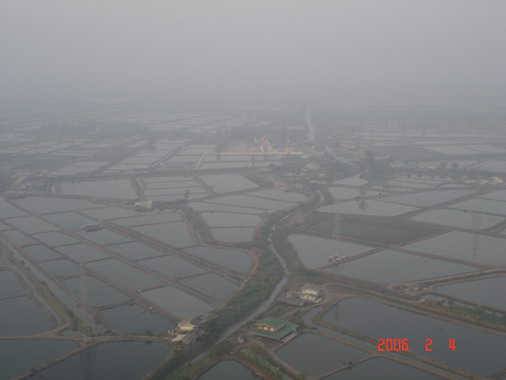 ควันพวยพุ่งขึ้นสูง ออกจากปล่องอยู่เบื้องหน้าระยะไกลๆ คือ โรงงานไฟฟ้าบางบ่อ ใช้ก๊าซแอลพีจี