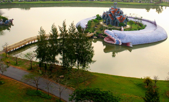 ตามความเชื่อว่า บนยอดเขาพระสุเมรุ จะเป็นสวรรค์ชั้นดาวดึงส์ ผู้ที่ทำความดีเท่านั้น จะได้ไปเสวยสุขในสวรรค์ชั้นนี้ รวมกับความเชื่อที่ว่า ปลาอานนท์เป็นผู้ค้ำจุนโลก....จึงรังสรรค์ปั้นแต่งตามจินตนาการของผู้สร้าง จนสวยงามอย่างที่เห็นในภาพ ครับ
