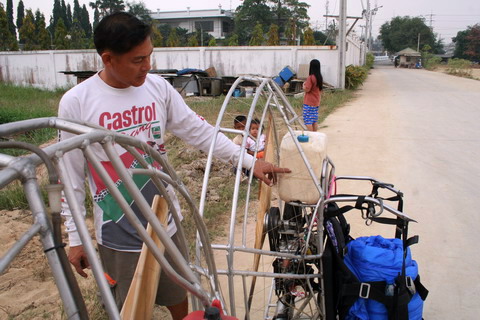 ครูทุย ชี้ให้ดูเครื่องของน้องต้น ที่กินน้ำมันไปแค่ครึ่งถัง เหลืออีก 5 ลิตร บินไป 2 โมงกว่าๆ ระยะทางตาม Track Computer จีพีเอส บอก 80 กม. ครับ