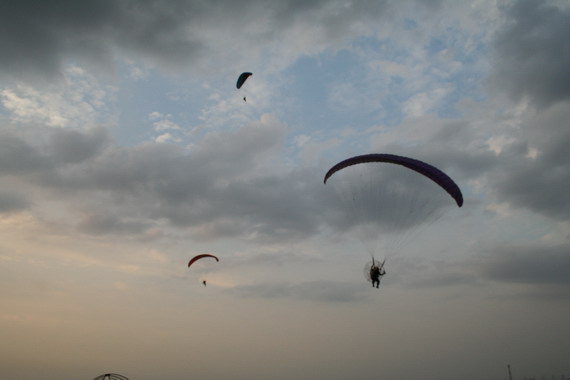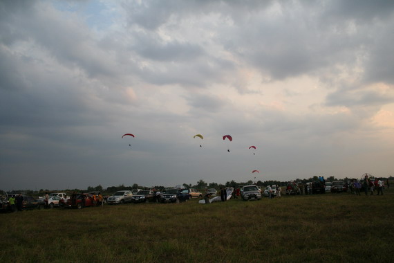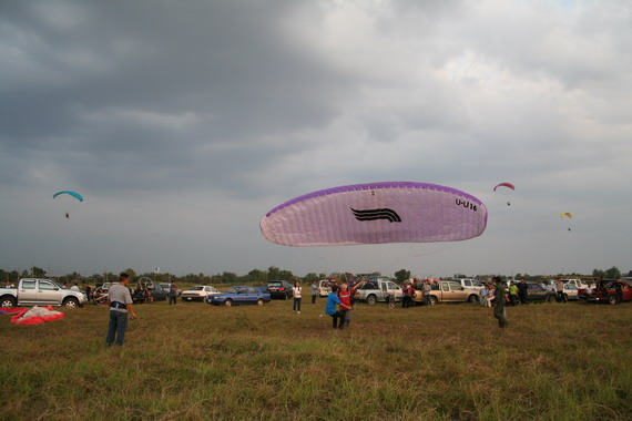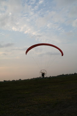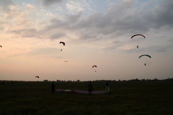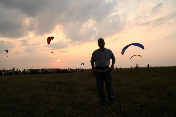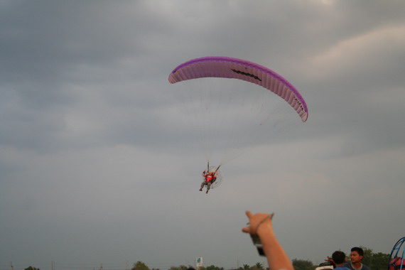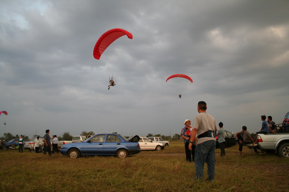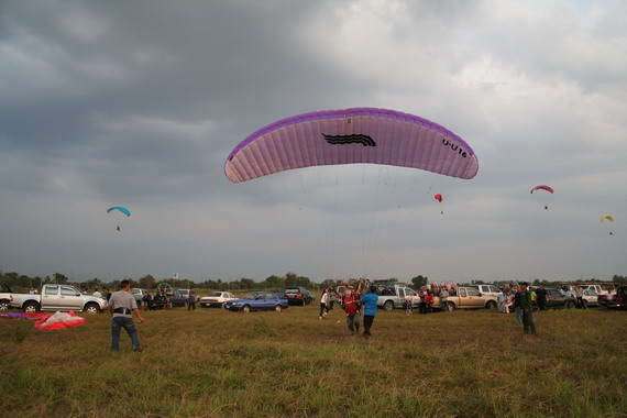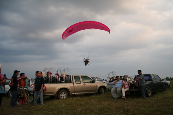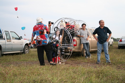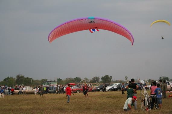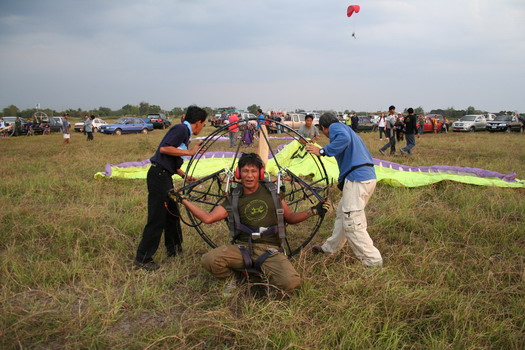 คุณลุงวาสิน อายุ 60 ปี จากมุกดาหาร กำลังจะขึ้น ลมแรงครับ มีครูทุยคอยช่วยดึง ไม่ให้ร่มกระชากล้มไปด้านหลัง ครับ