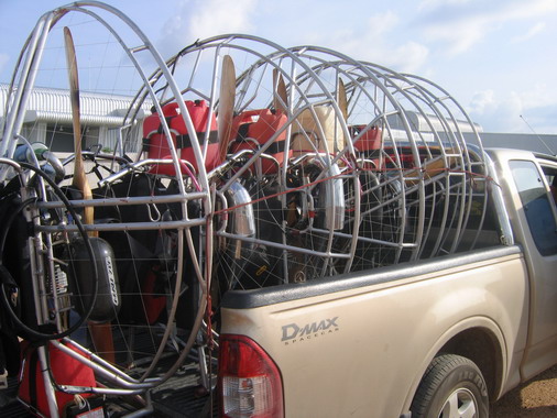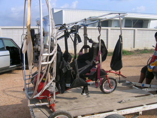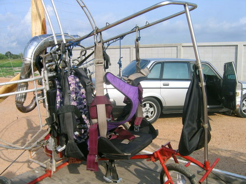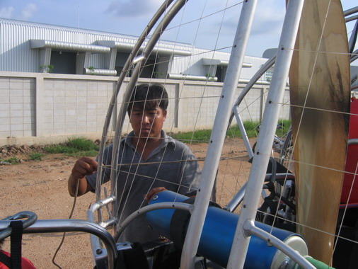 สามล้อบิน 2 คน หรือ ที่เรียกว่า สามล้อ Tandem ใช้เครื่อง Simonini ขนาด 270 ซีซี ใบพัดสามแฉก สตาร์ทไฟฟ้า ถังน้ำมันอยู่ด้านล่าง โครงเหล็กสามล้อเป็นรูปตัว T มีค่า Strength สูง.....เคยลงแรงๆ เหล็กไม่ยอมหัก แต่ยอมงอ ผล หนัก เป็น เบา ครับ