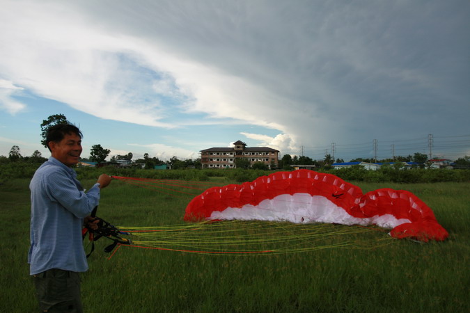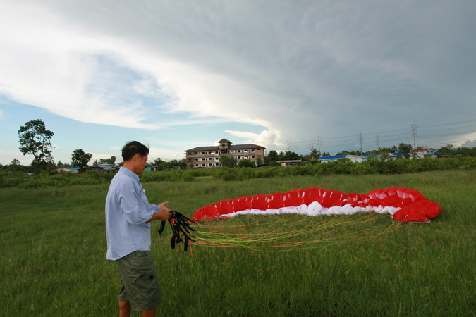 คุณราเชนทร์ หนึ่งในสมาชิกโสธรร่มบิน ช่วยครูทุย พับเก็บร่ม Adventure " PLATINIUM " ....เป็นอันจบสิ้น การทดสอบการตั้งร่ม ภาคพื้นดิน ภาพต่อไป ท่านจะได้ชมการบินทดสอบ ภาคอากาศ ครับ