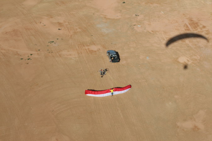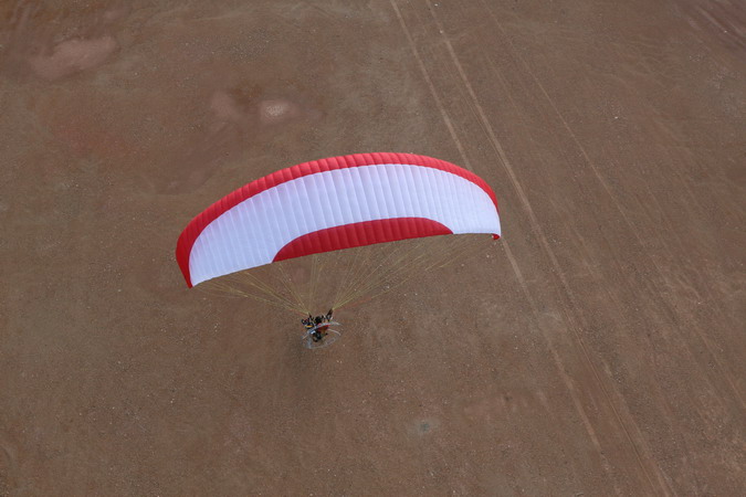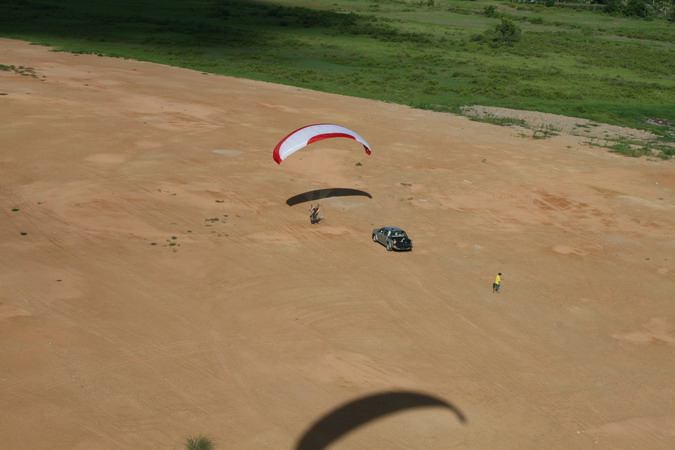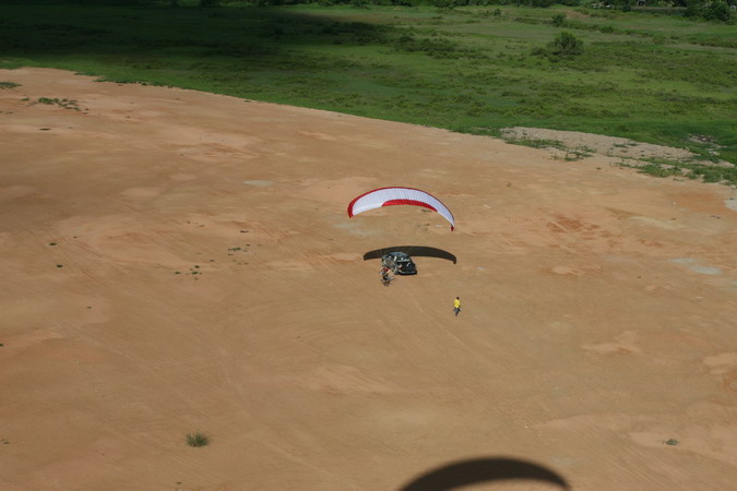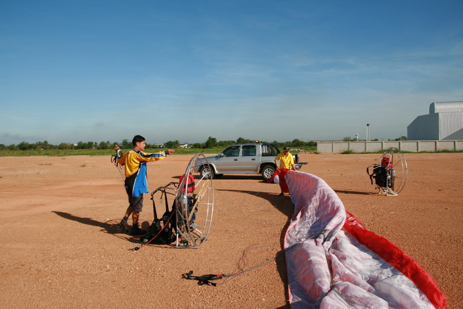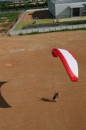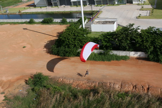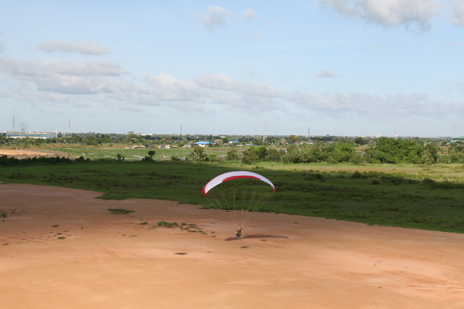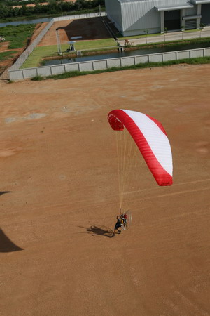 เวลา 07.10 น. ณ สนามดินแดง บางปะกง ฉะเชิงเทรา ครูทุยและพี่หงา ช่วยผมเกี่ยวร่ม ELLE XPERT เข้ากับเครื่อง RGV ส่งผมขึ้น มาบินลอยตัว รอเก็บภาพการบินทดสอบ Adventure PLATINIUM กลางอากาศ