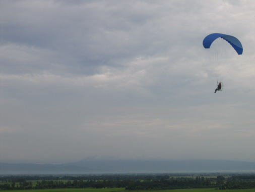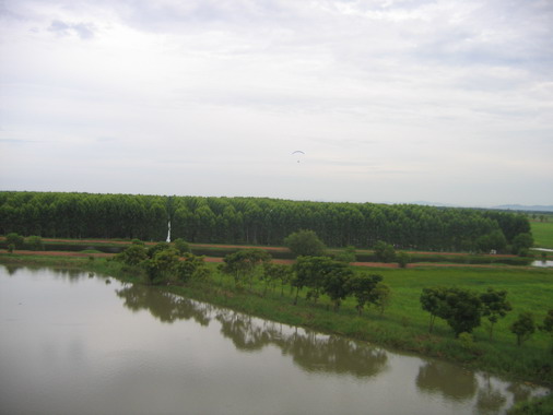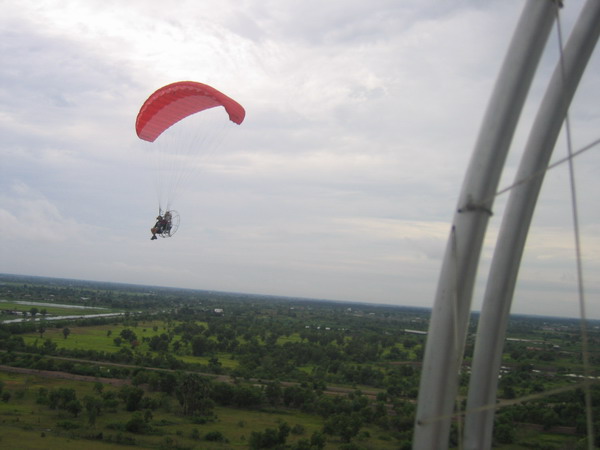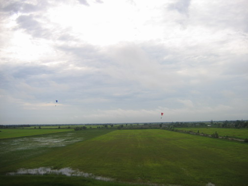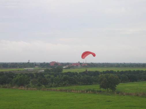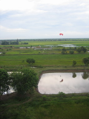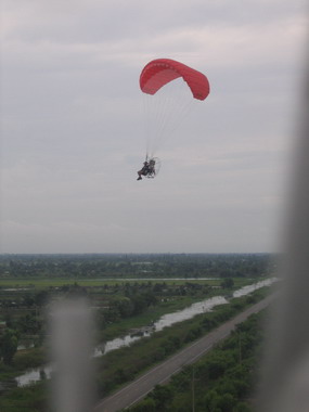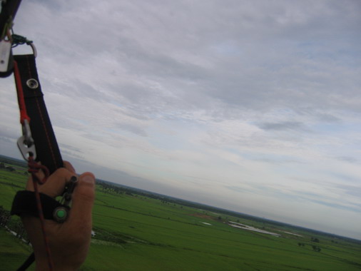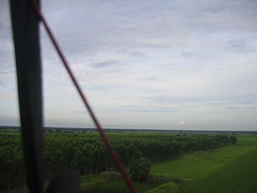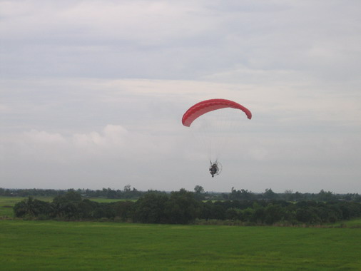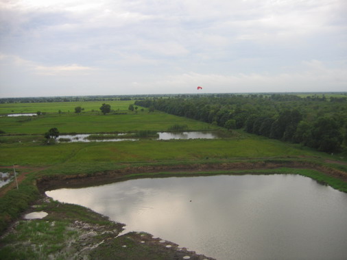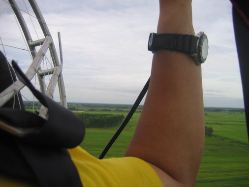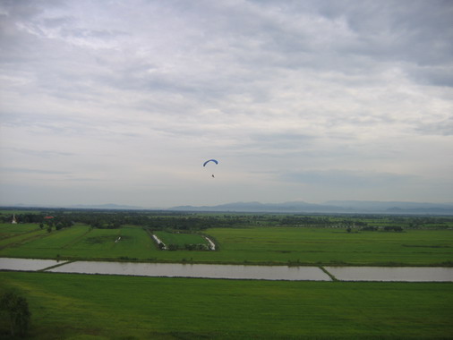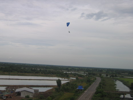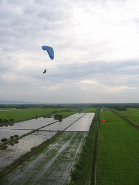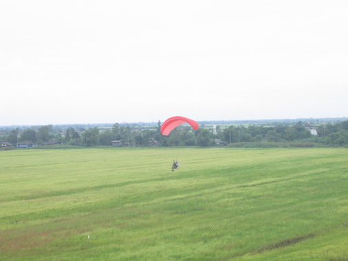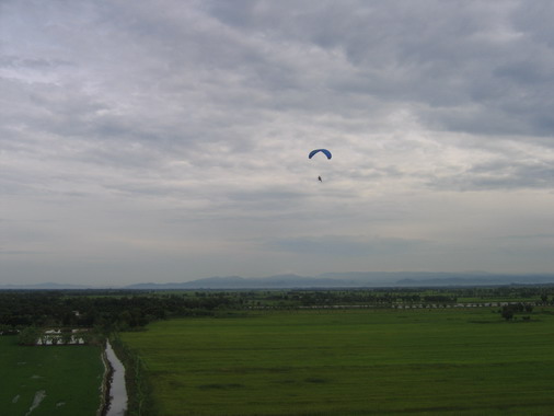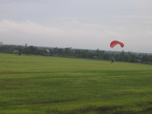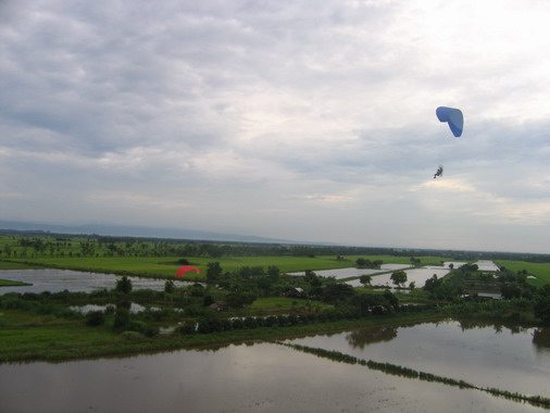 พวกเราบินทวนลม ในแนวเฉียง ตลอดเส้นทาง ลมเริ่มแรงขึ้น....ครูทุยบินเลียดไปตามท้องนาหลบลม น้องต้นยังบินอยู่สูง