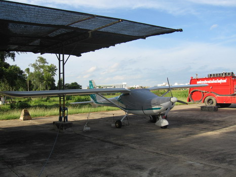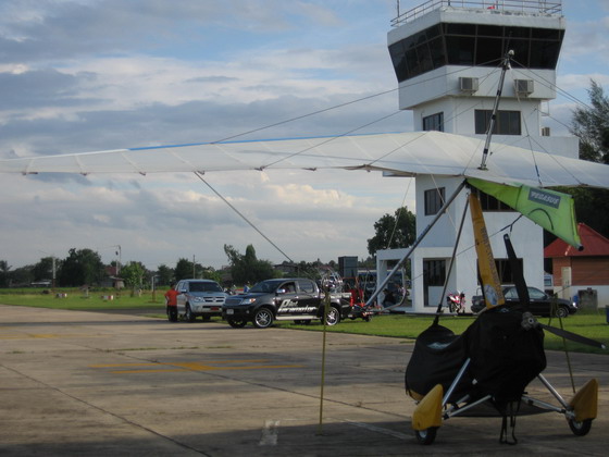 ภาพบน ไมโครไลท์จอดคลุมผ้า ณ สนามบินจังหวัดสุรินทร์... มาถึงสุรินทร์ตอนบ่ายวันศุกร์ที่ 11 สิงหาคม 49 นอนพักเอาแรงเก็บกำลังไว้บินช่วงเย็น