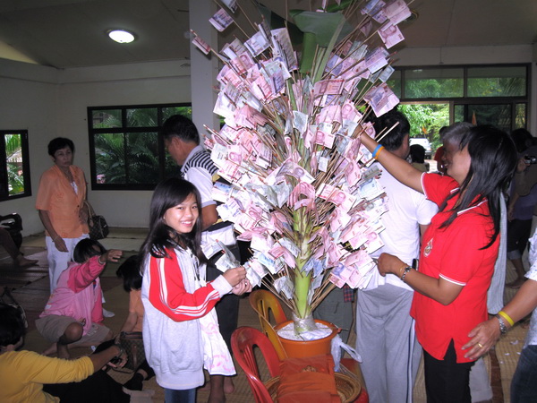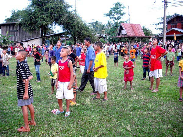 ในสนาม เด็กๆ ผู้ใหญ่ คนชรา มากันทั้งหมู่บ้านคับงานนี้ ได้แย่งกันเก็บท๊อฟฟี่ มีรางวัลอยู่ในนั้นด้วย