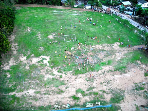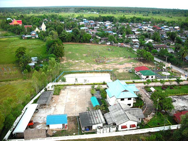 ไปสนามกันเลย ผมบินคนแรก เจอปลายฝนนิดๆ กลัวมาห่าใหญ่เหมือนที่ชลบุรี อย่างกะหมาตกน้ำ วนรอบโรงเรียนสองรอบ ลงดีก่า เดี๋ยวเดียวชาวบ้านก็มาเกาะรั้วดูบ้าง คุณครูไปตามเด็กนักเรียนมาดูกัน ..