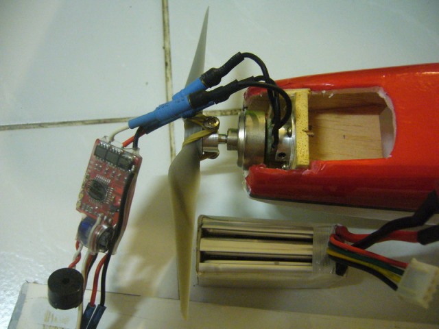 ใส่ มอเตอร์ CD-ROM ฐานกระดิ่ง + สปีด TD 10 แอมป์ + ใบ APC 4x5 + Lipo 3 cell 1000 ma + mini servo 3 g + รีสีฟ R146iP(กลัวคลื่นกวน)