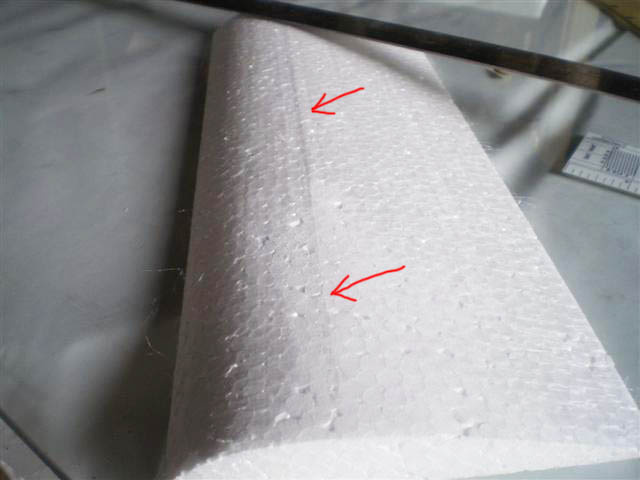 ท่อนแรก(ด้านในปีก)เอาแบบ 1 กับ 2 ไปประกบแล้วตัดเหมือนกับตัดปีกทั่วๆไป ท่อนที่สองคือท่อนปลายปีกก็ให้ถอดเอาแบบแอร์ฟอยที่ 1 หรือ 2 มาทาบด้านในของท่อนโฟมแล้วเอาแบบที่ 3 ทาบไว้ที่อีกฝั่งของท่อนโฟมซึ่งก็คือปลายปีกนั่นเอง แต่คราวนี้ก็ต้องติดแบบแอร์ฟอยขึ้นสูงกว่านะครับ (ดูภาพที่ผมเขียนคงเข้าใจ) แล้วก็ตัดได้เลยครับ เสร็จแล้วก็เอาปีกสองท่อนมาชนกันด้วยการทากาวแล้วเอาไม้สปายัดลงไปก็เสร็จแล้วครับ..