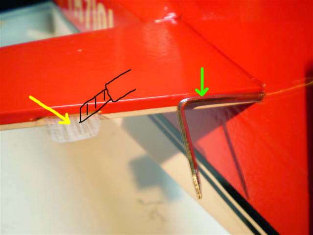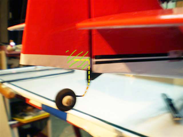 บริเวณที่ผมขีดเส้นสีเขียวนั้น ผมได้เสริมไม้เข้าไป เพื่อให้ความแข็งแรงกับแผ่นรัดเดอร์ครับ..เพราะลวดขาล้อต้องแทงเข้าไป...