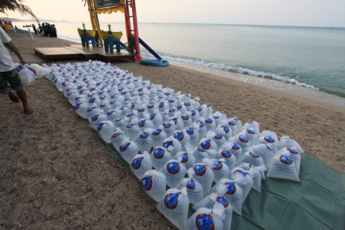 นอกจากทำความสะอาด เก็บขยะใต้น้ำ เก็บขยะบนชายหาด ก็ยังมีการปล่อยลูกปลากะพง ด้วย อยู่ในถุงๆแบบนี้ก่อน แล้วก็ยังมีการปล่อยหอยหวาน หอยมือเสือ