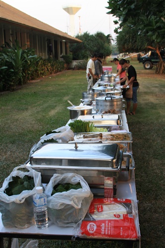 เขานัดให้มางานปาร์ตี้ รับประทานอาหารร่วมกัน เวลา 6 โมงเย็น เราก็เห้นเขาเอาอาหารมาตั้ง ตกใจอ่ะ โต๊ะอาการมันยาวมากกกกกกก ผู้จัดงาน บอกเตรียมไว้สำหรับ 300 คน แต่จริงๆคืนนี้คนอยู่ไม่ถึง
