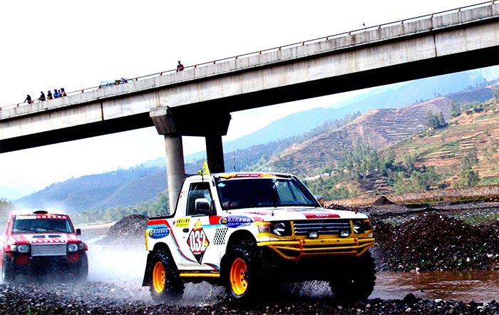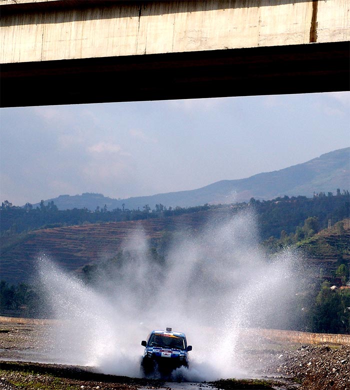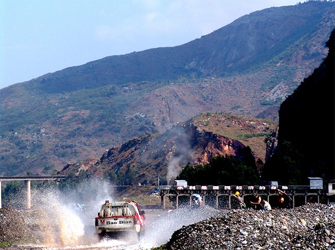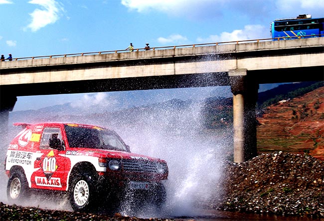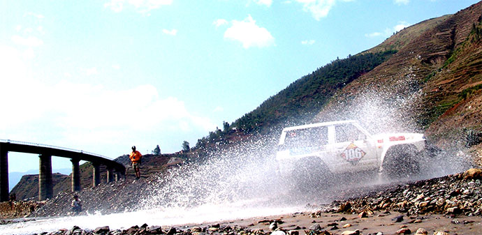 จากตอนที่แล้วเช้า30 เมษายน วันที่สองของการแข่งขันก็ทำให้ทราบแน่นอนว่า การแข่งขันวันแรกที่หมู่บ้านอู่หลงหรือมังกรดำ เพื่อจัดอันดับแข่งขันระยะทางแค่ประมาณ 30 ก.ม.ในแม่น้ำเฉียวเจียง มีนักบู๊ออฟโรดมังกรจีนพลาดท่า รถยนต์พลิกคว่ำสังเวยพระแม่น้ำเฉียวเจียงไปหนึ่งคัน และอีกหลายทีมช่วงล่างโช้คอัพเริ่มพังกันแล้ว แต่สำหรับวันนี้ต้องนับว่าเป็นการเริ่มสัมผัสการบู๊ผจญภัยหฤโหดสุดของจริงแน่นอน ด้วยต้องลงแข่งขันกันในระยะทางประมาณ 30 ก.ม. เส้นทางสมรภูมิออฟโรดวันนี้แม้นยังไม่ยาวเหยียดตลอดทางในแม่น้ำ ตั้งต้นตั้งแต่ เก๋อเล่อะ เซี่ยวโพโต้วฟูโก้ว เจี่ยงเจียโก้ว ซึ่งกับดักตามเส้นทางเป็นร่องน้ำตื้นน้ำลึกเป็นช่วงๆ แม้นยังพอมีพื้นที่ให้หาทางหลบหนีเลี่ยงได้ แต่การเสี่ยงมั่วดวงรีบลนแยกออกไปจากทางร่องถนนหรือรอยล้อคนอื่นๆ ก็มีสิทธิแจ็คพ็อดเจอทางตันหรือหลงไปเจอทะเลหินขวางหน้าเอาดื้อๆได้เสมอ ดังนั้นการเหยียบอัดความเร็วไปตามร่องรอยล้อเดิมที่มีอยู่ อาจจะเป็นทางอ้อมยาวแต่ดูแล้วปลอดภัยไปฉลุยไร้กังวลมากกว่า สำหรับเส้นทางที่เป็นบริเวณมีผู้ดักชมติดตามชมดูมากที่สุด จะอยู่แถบช่วงเซี่ยวโพโต้วฟูโก้ว ซึ่งเป็นจุดตัดระหว่างแม่น้ำเฉียวเจียงกับถนนทางรถยนต์ที่ตรงไปเมืองตุงชวน ทำให้สะพานข้ามแม่น้ำที่ยาวเกือบ 300 เมตร กลายเป็นทำเลเหมาะเจอะในการเฝ้าดูการแข่งขัน อีกทั้งยังสามารถเดินลงไปดูอย่างใกล้ชิดในก้นแม่น้ำไม่ลำบากเท่าไรได้อีกด้วย นอกจากนั้นเลยจุดนี้ไปอีกประมาณ 2-3 ก.ม. ยังมีสะพานรถไฟโค้งเกี่ยลู่ต้าเฉียวยาวกว่า 500 เมตรโค้งตัดข้ามแม่น้ำให้ภาพวิวสวยงาม ตัดกับทิวทัศน์ธรรมชาติท้องน้ำและภูเขาสูง และบริเวณสะพานขาดพังกลางแม่น้ำใกล้ๆใต้สะพานทางรถไฟเกี่ยลู่ต้าเฉียว ซึ่งชาวบ้านท้องถิ่นแถวนี้เคยใช้รถยนต์เดินทางข้ามไปมาผ่านกลางท้องน้ำมาก่อน เป็นอีกจุดหนึ่งที่แฟนๆออฟโรดแรลลี่เจ้าถิ่นหรือผู้รู้มากทั้งหลาย สามารถลุยลงมายึดทำเลชมสมรภูมิบู๊ โดยอาศัยยืนดูบนสะพานขาดพังๆเก่าๆจากการโดนกระแสน้ำพัดกระจายมาก่อนหน้านี้นานแล้ว