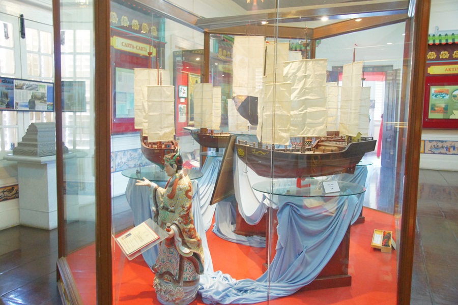 Baba And Nyonya Heritage Museum Melaka Tengah พิพิธภัณฑ์เมืองมะลากา แสดงการเข้ามาค้าขายของชาวจีนในสมัยกองทัพเรือเทพเจ้ามังกรแห่งท้องทะเล “เจิ้ง เหอ(Zheng He) หรือ เฉิง โฮ(Cheng Ho) ทำให้เริ่มมีชาวจีนมาตั้งรกรากอยู่ที่นี่ ไม่น้อยกว่าสี่ห้าร้อยปีมาแล้ว