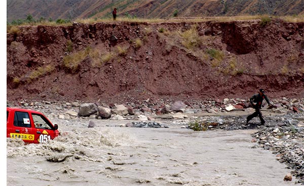 เลือกเส้นทางข้ามน้ำสั้นที่สุด ต้องลุยฝ่าน้ำลึกไหลเชี่ยวกรากใกล้หินใหญ่ทั้งโผล่มาให้เห็นและใต้น้ำ ติดอยู่กับหินสองสามนาทีแต่โชคดีน้ำไหลแรงกลับเป็นเทพีแห่งโชค ทำให้ขยับไหลหลุดรอดผ่านไปได้อย่างทุลักทุเล! หมา เฉี่ยว หลี่ / หวัง ไห่ ปิ้ง ทีมจู้ฟง บิ้กวิง