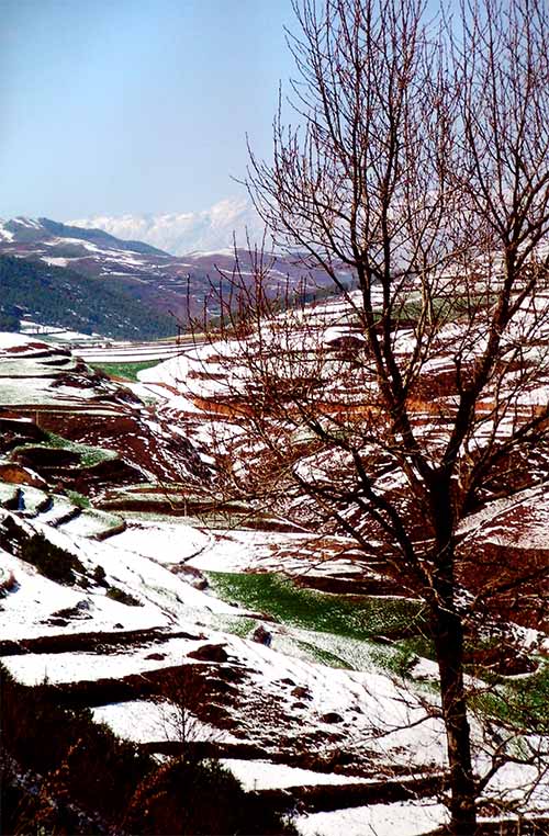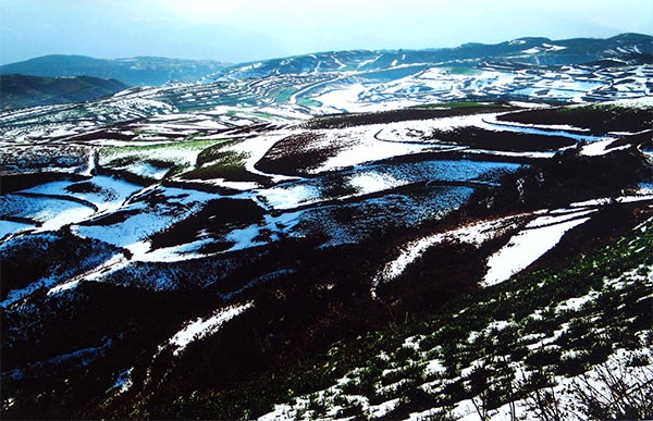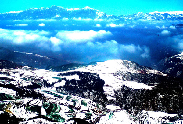 ภูเขาหิมะจาวซึ ชื่อภูเขาลูกนี้ได้มาจากการวัดแผนที่ว่าเป็นภูเขาที่ตั้งอยู่ตรงกลางเทือกเขา มีความแตกต่างหลายอย่างรวมทั้งรูปร่างลักษณะของภูเขาที่ดูคล้ายโต๊ะและเก้าอี้ที่ประทับของจักรพรรดิ ยิ่งไปกว่านั้นยังได้มีการค้นพบน้ำตกสดใสไปด้วยน้ำแข็งและหิมะที่สวยงามที่สุดในภาคตะวันออกเฉียงเหนือของประเทศจีน,มีทะเลสาบที่เงียบสงบ,สายน้ำตกไหลสวยงาม,หุบเหวสูงชัน,ภูเขาสูงตระหง่าน, มีซากหลากหลายของพันธุ์พืชและสัตว์ชนิดต่างๆในชั้นของน้ำแข็ง ซึ่งมีค่าอย่างมากมายในการศึกษาหาความรู้ ภูเขาหิมะจาวซึจึงเป็นที่รู้จักกันเป็นอย่างดีว่าคือสถาบันวิจัยวิทยาศาสตร์และธรรมชาติ สิ่งที่โดนพัดพามากับน้ำแข็งตก ได้รับการพิจารณาเอาใจใส่ว่าเป็นฟอสซิลที่มีชีวิตสำหรับการวิจัยหาความรู้ยุคสมัยน้ำแข็ง นับเป็นความรู้ดุจดังธนาคารยีนรวมทั้งความสมบูรณ์ประเภทของสัตว์และพันธ์ไม้ต่างๆ ในเขตตอนกลางของมณฑลยูนนาน