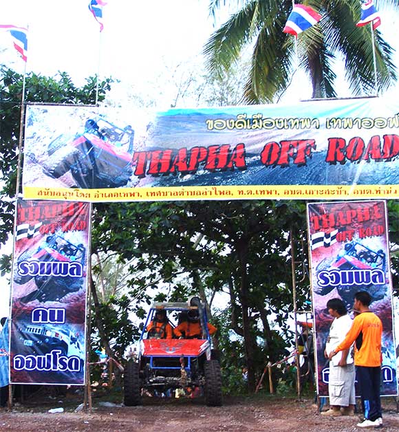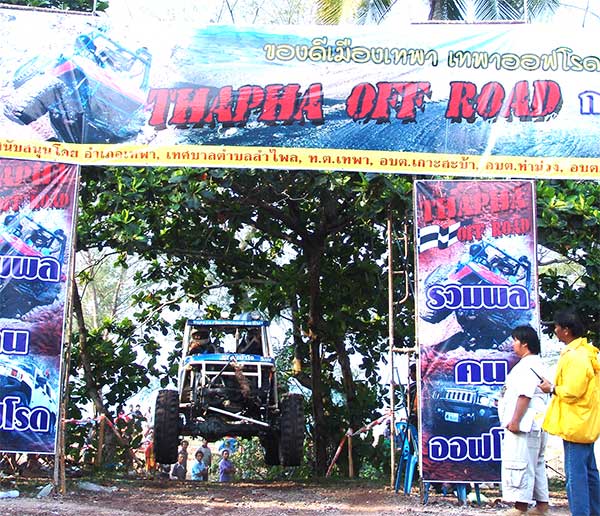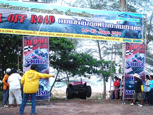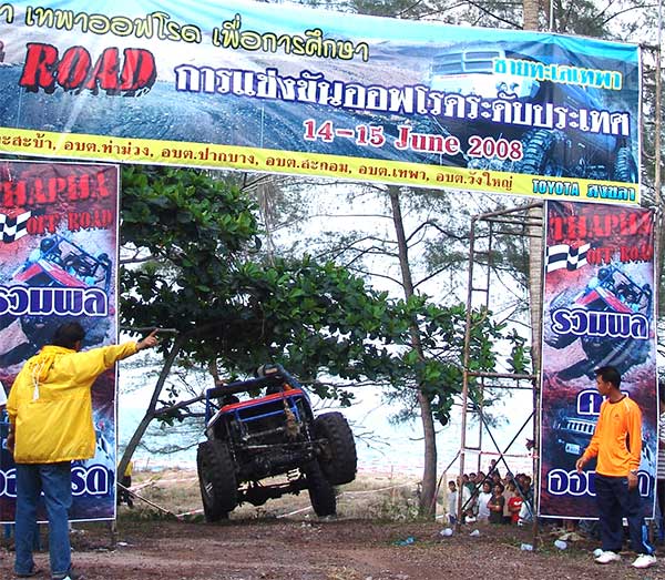สนามริมทะเลเทพาเป็นสนามแข่งขันแบบคู่ขนานสองเส้นทาง แยกคิดคะแนนออกจากกันเป็นคนละSS รุ่นปีกนกและคานแข็งจะลงแข่งขันสนามนี้ 4 SS แต่รุ่นโอเพ่นแข่งขันที่นี่เพียง 2 SSและย้ายไปสนามลำไพลแข่งขันต่อในช่วงบ่ายอีก 4 SS สนามเทพานี้มีความยาวประมาณ 300 เมตร พื้นเป็นทรายแห้งฟูริมทะเลยิ่งลุยยิ่งหนืด เส้นทางคดเคี้ยวไปมา ผ่านใต้แนวต้นมะพร้าวมีเนินสูงต่ำดักเป็นระยะ ปัญหาความยากอันตรายอยู่ที่ทรายหนึบหนืดสามารถทำให้ครัชไหม้เครื่องยนต์พัง หรือเพลาแตกกระจายได้ง่ายดาย ความมันส์เร้าในช่วงเช้านี้ เพียงแค่ช่วงแรกมีจอมบู๊ดีเดือดของภาคใต้เหาะเหิรพลาดลงมาไถลไปปีนขึ้นต้นไม้ข้างทางทำให้พลิกคว่ำตะแคงทันที สมรภูมิทรายจึงเป็นความสนุกสนานเร้าใจอีกแบบ ที่ได้เรียกเสียงครางความถูกใจของผู้ชมไปทั่วสนามเกือบตลอดเวลา