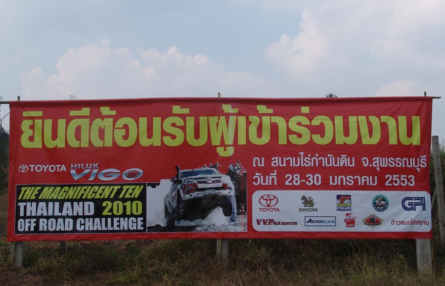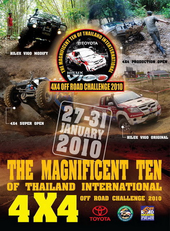 TOYOTA HILUX VIGO THE MAGNIFICENT TEN EVENT 2010 The top legend off road event of Thailand about 7 years ago was hosted by Off Road magazine under Grand Prix International Co., Ltd. From January 29-31 , 2010 at Rai Kumnun Din in national area 20,000 rai , Dan Chang distric , Suphanburi city and at Samkhok , Samkhok distric , Pathumthani city about 280 k.m. and 50 k.m. from Bangkok. The competition was support from Toyota Motors Thailand Co., Ltd that it had to change name event from Magnificent Ten to be Toyota hilux Vigo the Magnificent Ten which the champion got 50,000 Baht and team categorize champion got 100,000 Baht. And the event had live in T.V. channel 11 on May 31, 11.00 a.m.-12.00 p.m.