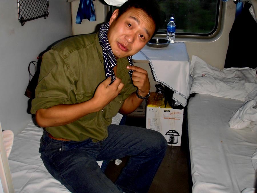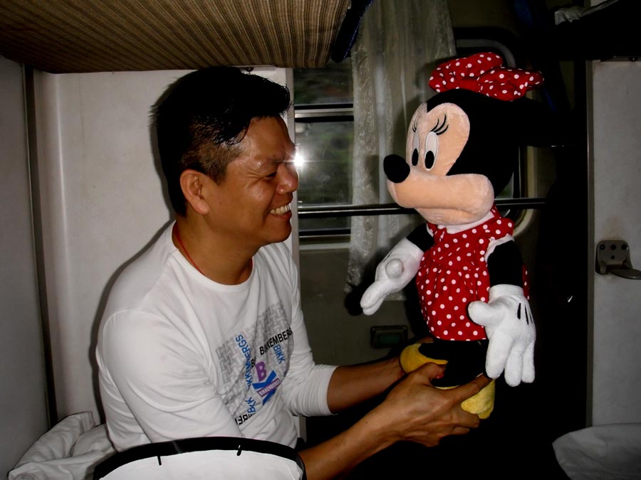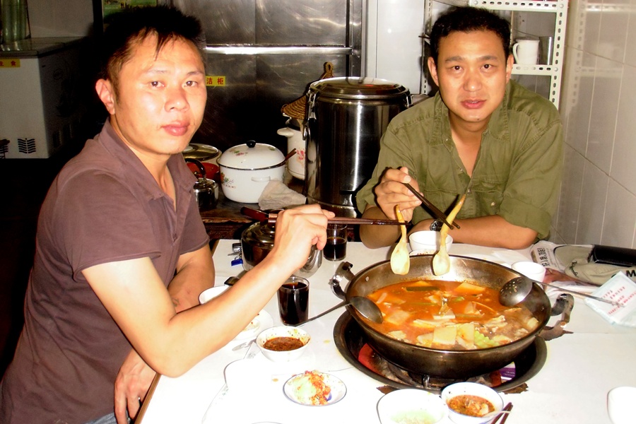 อาเฮียพ่อครัวร้านอาหารในเมืองเก่าลี่เจียง และอาซิ้มร่วมห้องอีกคน คุยกันมันส์ปากอัธยาศัยดี โชคดีที่อาจารย์ไรโนคอยเป็นเต่าหยิ๋วหรือไกด์แปลภาษาจีนมาเป็นภาษาอังกฤษให้ เลยทำให้การเดินทางสนุกสนานสัมผัสชีวิตชาวจีนชาวบ้านท้องถิ่นจริงๆ ซึ่งทำให้รู้ว่าชาวจีนแท้ๆหลายคนมีนิสัยใจคอดี น่ารัก เป้นมิตรและชอบหรืออยากคุยกับคนต่างชาติมากกว่าสมัยก่อนๆเยอะ นอกจากนั้นในภาพนี้อาเฮียกำลังโชว์ตุ๊กตาพูดโต้ตอบกันได้ ที่ซื้อมาจากดิสนี่ย์แลนด์ฮ่องกงตัวละหมื่นกว่าบาท เพื่อเอามาฝากลูกสาว นี่แสดงถึงความร่ำรวยของชาวจีนนั้นได้แผ่ออกมาถึงชนชั้นกลางแล้วอย่างเด่นชัด!