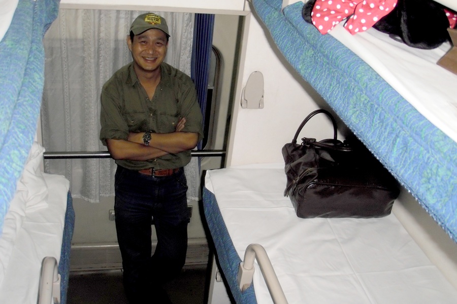 เดินทางรถไฟในประเทศจีนต้องจองเตียงนอนชั้นล่างสุดหรือชั้นหนึ่ง จะมีช่วงระหว่างชั้นช่องว่างเยอะ สามารถนั่งได้ด้วย ภาพนี้อาจารย์ไรโนก็อดได้นอนเตียงล่างสุด ต้องไปนอนอึดอัดตัวชั้นที่สองช่วงเดินทางขาไปเหมือนแรดบิน ก็ดันจองตั๋วล่วงหน้ากันไม่กี่ชั่วโมงเท่านั้น !