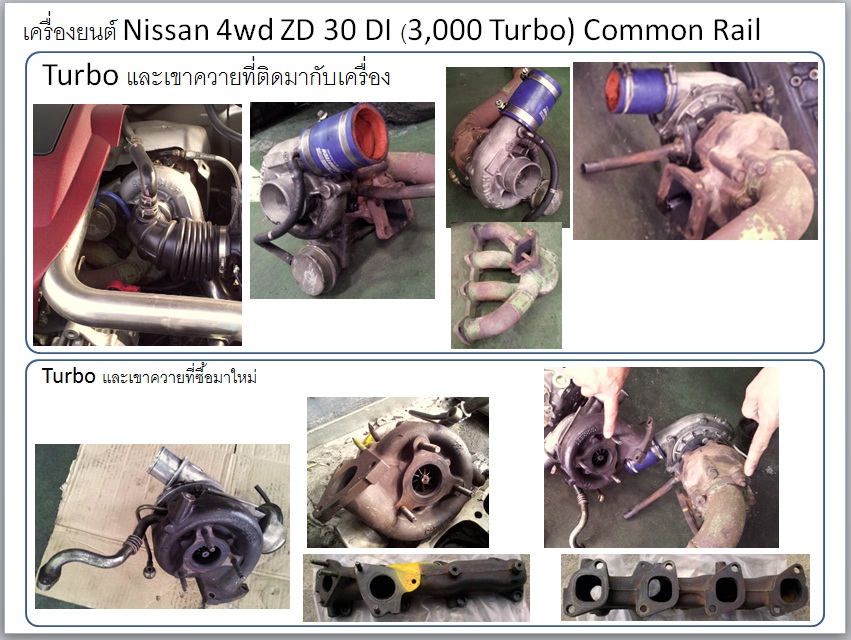 พอดีซื้อรถมือสองมา ประมาณ 6 เดือนแล้วเป็นรถนิสสัน ฟรอนเทียร์ 4wd ZD3000 Turbo ครับต้นเดือนที่แล้วส่งรถซ่อมที่ศูนย์ และทางศูนย์บอกว่า Turbo ที่มากับเครื่องเสียและเป็นตัวแปลงที่ีไม่ตรงแสตนดาร์ดด้วย ผมก็เลยไปซื้อมือสองมาตัวหนึ่ง แต่ทางศูนย์บอกว่า ก็ยังใช้ไม่ได้เพราะไม่ตรงแสตนดาร์ดอีก ผมหามาเป็นเดือนหลายตัวแล้วก็ยังใช้ไม่ได้ ตอนนี้ซื้อมาอีกตัวหนึ่่งราคา 14,000 คนขายบอกว่าเป็นตรงรุ่นเลยแต่ต้องใช้เขาควายที่แถมมาให้ พอเอาไปให้ทางศูนย์ ช่างศูนย์บอกว่ายังใช้ไม่ได้อีก