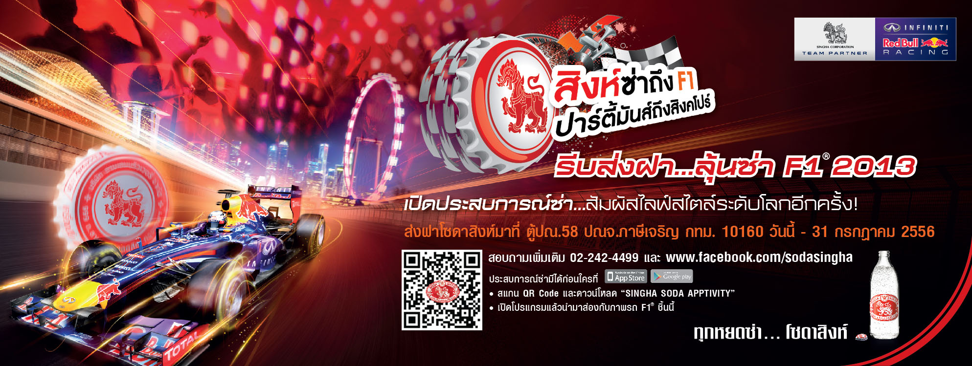 โอกาสครั้งใหม่ที่ชีวิตจะได้สัมผัสไลฟ์สไตล์เหนือระดับกับการแข่งขันรถฟอร์มูล่าวัน "F1 Night Race" ประเทศสิงคโปร์ อัดแน่นความสนุกจากคอนเสิร์ตศิลปินระดับโลก พร้อมปาร์ตี้สุดเทรนด์ที่คนทั่วโลกต้องจดจำ โซดาสิงห์เท่านั้นที่พาไป! ส่งฝาโซดาสิงห์ที่ตู้ ปณ.58 ปณจ.ภาษีเจริญ กทม. 10160 วันนี้-31ก.ค.56 (รางวัลเป็นแพคเกจท่องเที่ยวประเทศสิงคโปร์ 4 วัน 3 คืน พร้อมบัตรเข้าชมการแข่งขัน F1 Night Race)