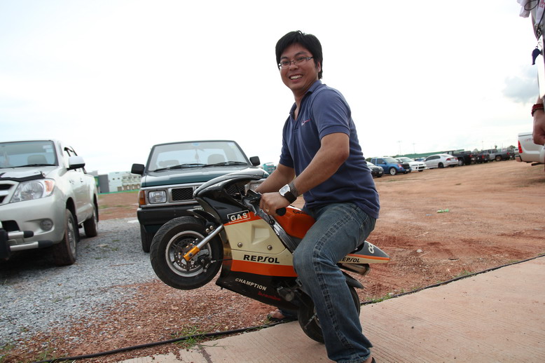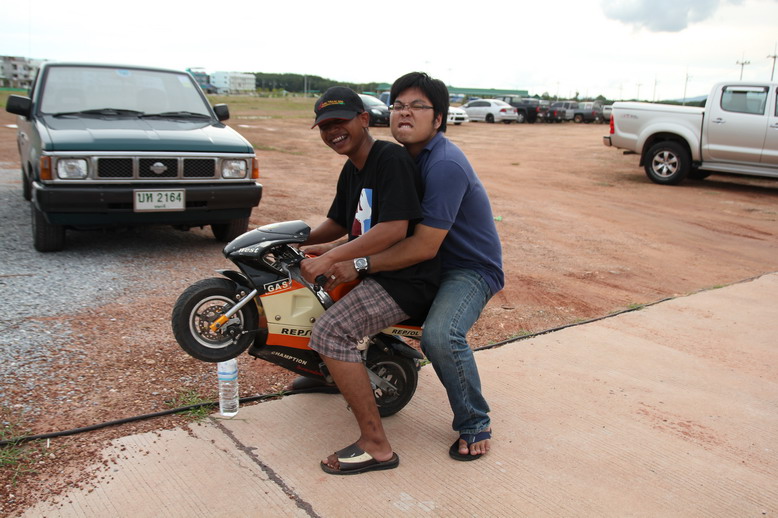 เห็นสองหนุ่มนี้พยายามที่จะนั่งมอเตอร์ไซค์คันเล็กนิดเดียวให้ได้ พยายามเหลือเกิน