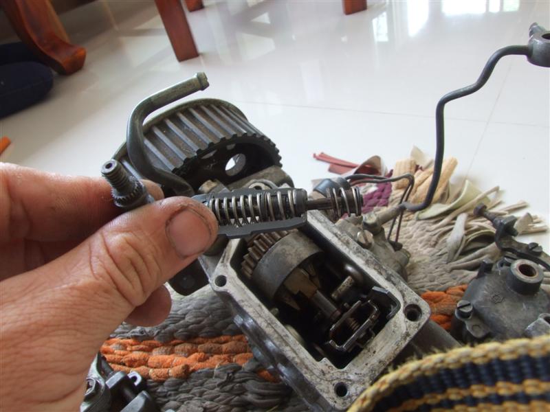 เลข 1 คือสลักที่ต้องตอกออกให้พ้นทางครับ เพราะมันขวางทางเลข 2 ซึ่งเกี่ยวกับสปริงแกนคันเร่ง และ เลข 3 คือตัวที่ต่ออยู่กับน๊อตเร่งน้ำมันหรือที่เราเรียกกันว่าน๊อตตูดปั๊มนั่นเองครับ ซึ่งน๊อตตัวดังกล่าวจะหมุนติดอยู่ที่ฝาปั๊มครับผม