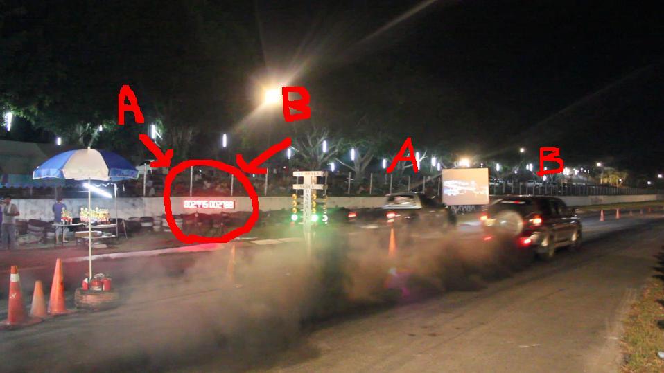 ย้อนกลับมาดูรูปนี้กันซักนิด ผมข้องใจว่า เครื่องจับเวลา เมื่อไฟเขียว เวลา่สองแทร็คมันต้องวิ่งพร้อมกันไปจนกว่าใครจะเข้าเส้นก่อน