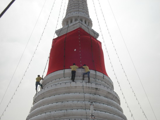 พิธีการห่มผ้าองค์พระสมุทรเจดีย์ มีขั้นตอนมาก ใช้คน 9 คน อยู่รอบองค์พระสมุทร โดยการโรยตัวดังภาพ