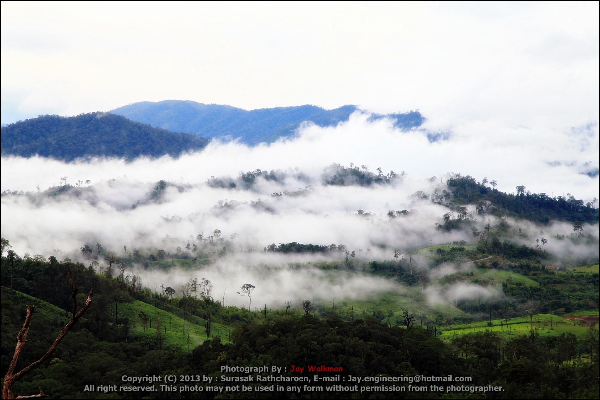 หลังจากนั้นฝนตกตลอดทาง มาหยุดอีกทีก็ตอนเริ่มเดินขึ้นยอดเพื่อไปยังแคมป์คืนแรก หลังฝนตกก็เจอหมอกที่ไหลปกคลุมตามเนินเขาด้านล่าง