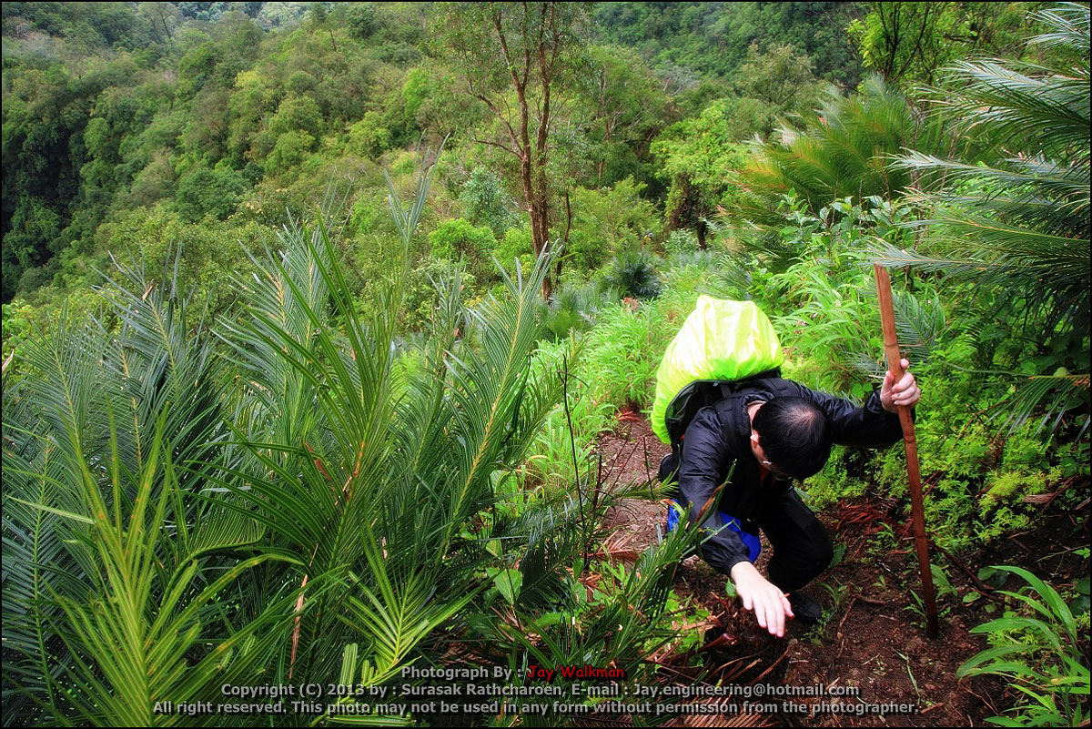 หลังจากเดินขึ้นมายังแคมป์ เพื่อทานข้าวเที่ยงแล้ว ก็เก็บแคมป์แบกเป้เดินขึ้นไปยังแคมป์ที่2 ที่อยู่เนินก่อนขึ้นไปยังมะม่วง 3 หมื่น ทางช่วงนี้ค่อนข้างชนและอันตรายครับ
