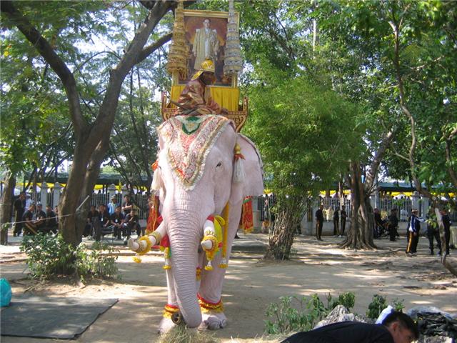 ส่วนช้างเผือกเป็นสัญลักษณ์สำคัญในประวัติศาสตร์ของประเทศไทย ในฐานะสัญลักษณ์แห่งพระราชอำนาจ จำนวนช้างเผือกที่กษัตริย์ครอบครองบ่งบอกถึงอำนาจของพระองค์ ช้างเผือกจะหายากมาก หนังของมันเป็นสีชมพูแทนที่จะเป็นสีเทา และพวกมันมีเล็บสีขาวและขนหางสีขาว