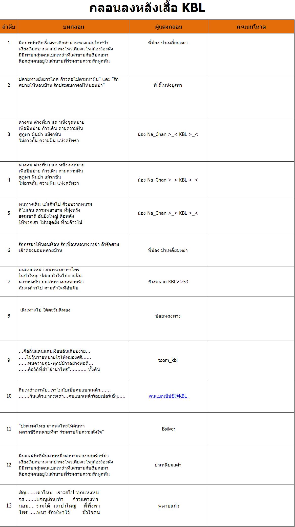 เอา ละ จากที่ ระยะเวลา ร่วม กิจกรรม การ ส่งกลอน ที่ผ่าน มา ผมได้ รวบ รวม ให้แล้ว ได้ทั้งหมด 13 กลอน ซึ่ง ยังไม่มีคะแนน โหวตเป็นที่แน่ชัด ดังนั้น ผมขอให้ ทุกท่าน ช่วย เริ่มโหวต ได้ตั้งแต่ วันนี้ จนถึง 31/8/54 ครับ และผมจะ นำผลสรุป แจ้งให้ทราบอีกครั้งครับ