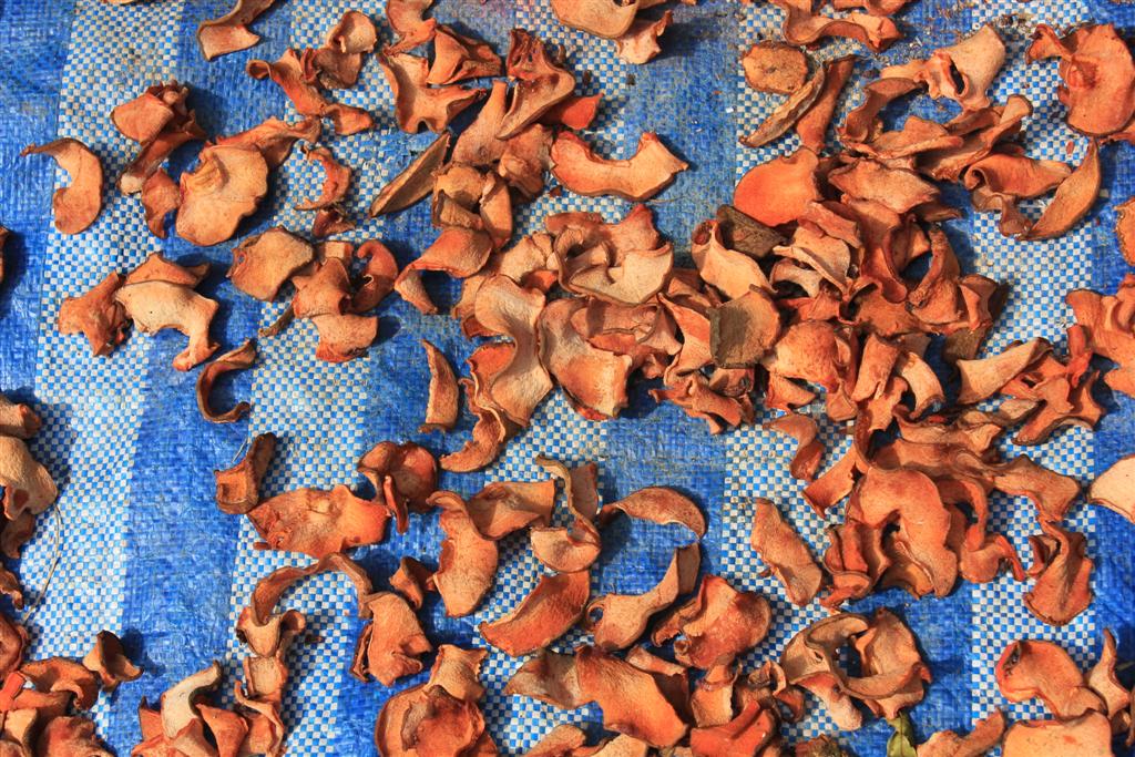 น่าจะเป็นลูกส้มแขกขวาน บาง ๆนำมาตากแดดแห้ง ใช้ใส่อาหารให้มีรสเปรี้ยว ผลผลิตของชุมชน