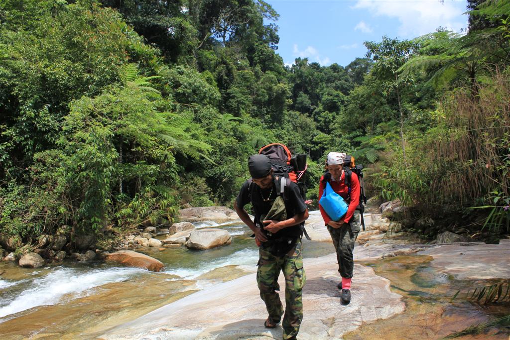 จากจุดข้ามคลองมาฝั่งนี้ รถมาไม่ได้ เลยเริ่มลงเดินกันครับ การเดินในช่วงแรก2-3 ชั่วโมงจะเป็นเส้นทางเลาะเลียบลำคลอง ไต่ระดับแบบไม่หนักมาก เป้าหมายคือที่พักตีนเขาส่วนที่ชันมาก แต่ช่วงที่พ้นสายน้ำจะเป็นป่าโปโปร่งไปอีก3-4 ชั่วโมง วันแรกเดินเรื่อย ๆ ถือว่าใม่หนักมาก