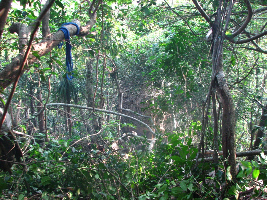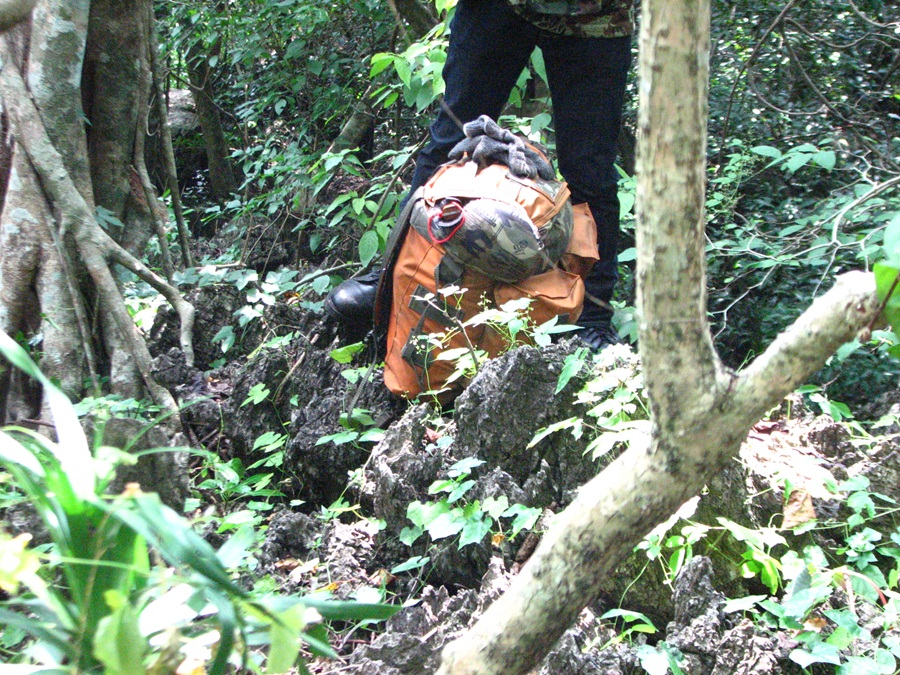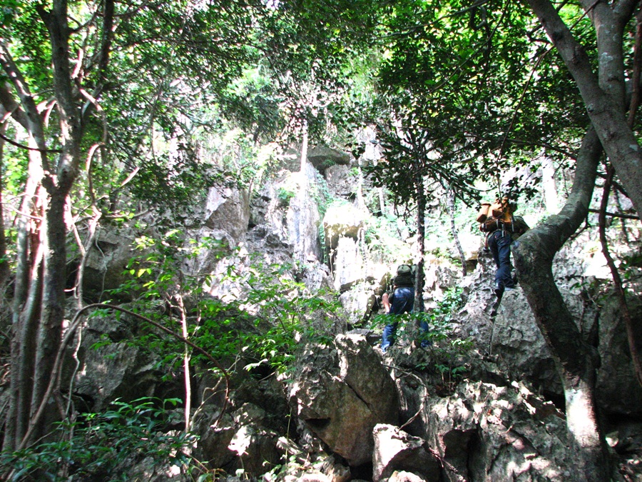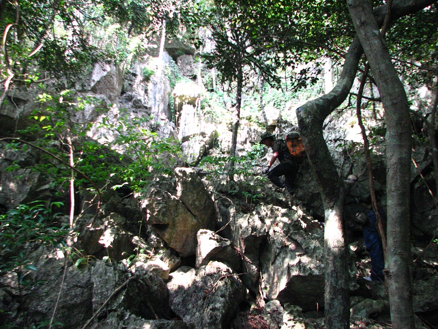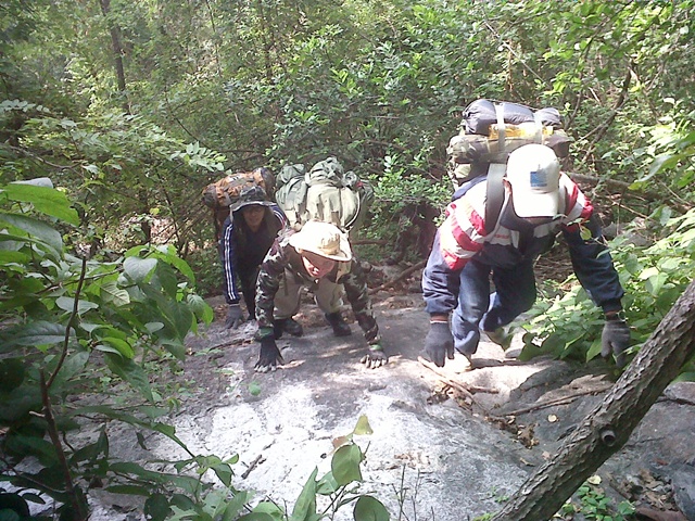 การเดินในช่วงบ่ายของเรายากลำบากขึ้นครับ เพราะเป็นป่ารกทึบ และแนวหินสูง ไม่มีเส้นทางเดิน (ที่จริงก็ไม่มีตั้งแต่เริ่มเข้าป่าแล้วละครับ แต่ยังไม่ทึบมาก)
