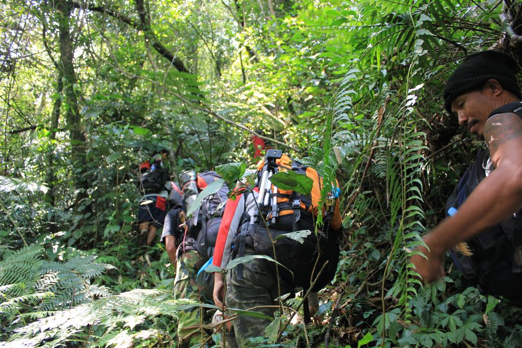 หลังจากกินข้าวเที่ยงเสร็จหลบเลี่ยงผาชัน ตามทางเลี่ยงผา ก็เริ่มเดินขึ้นไต่ระดับไปหาเนินแรก ซึ้งเส้นทางช่วงนี้จะมีหลายเส้นทางตามร่องรอยสมเสร็จที่ขึ้นลงเขา เดินเสียโปรนไปหมด แต่อยากให้เป็นทางกระทิง หรือทางช้างเสียมากกว่า จะใด้ไม่ต้องก้ม ๆเงยๆหรือมุดช่องกอใผ่เลื้อย ช่องมันแคบเสียเหลือเกินในบางช่วง