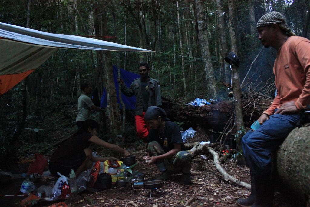 สำหรับวันนี้ก็ถึงที่พักแคมป์แรกตามเป้าหมาย พอมีเวลาสำหรับ เตรียมอาหารและที่พัก แบบไม่ฉุกล่ะหุกนัก ชั่วโมงกว่า ๆก่อนมืดค่ำช่วงหลัง ๆก่อนถึงที่พักจะเป็นป่าไม้ใหญ่สูงโปร่ง ไม่รกมากนัก แหล่งน้ำก็ ลงไปอาบ หรือตักกหนึ่งหอบตอนขาขึ้นกลับมาครับ เป็นร่องน้ำเล็ก ๆพอตักอาบได้ ผมพลาดท่า ไสลก้นจ่ำบะลงไปอีก 3-4 เมตรเนื่องจากจับเฟิร์นยื่นต้นตาย พยุงตัวเบา ๆแต่เสียหลักเฟิร์นล้ม อันนี้ล้มแรก ใน 5-6ครั้งของทริปนี้ แต่ไม่บาดเจ็บอะไร