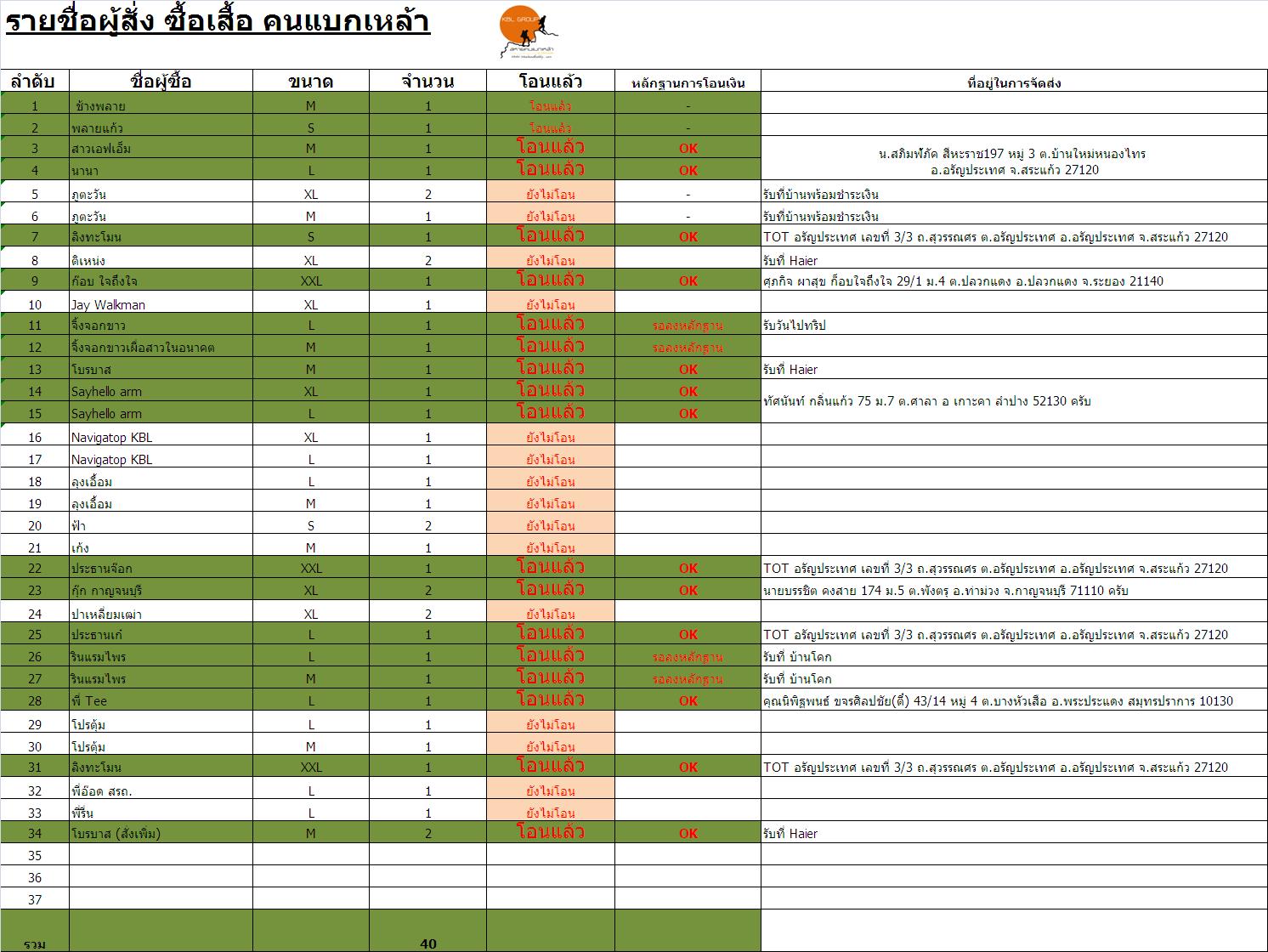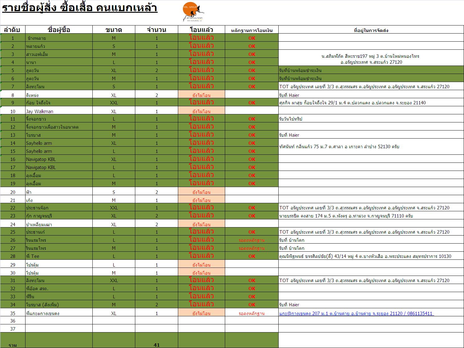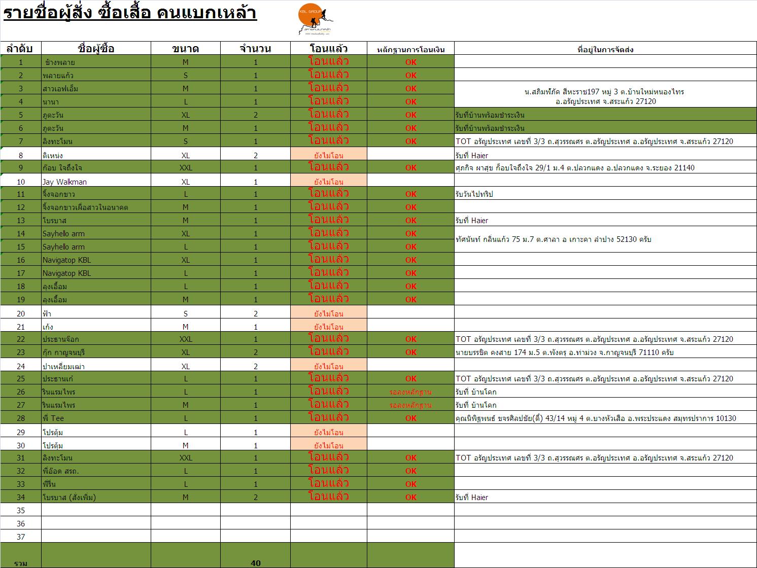 ทางร้านที่กบินทร์บุรี เข้าใจผิดที่ เสื้อจะได้ วันที่ 28/11/54 เนื่อง จากทางร้านสกรีพลาสติกที่ จ. สุพรรณ ดูชื่อดิว ส่งลูกค้าผิด ....ของกลุ่ม คนแบกเหล้า จะได้รับเสื้อ ไม่เกิน วันที่ 10 /12/54 แต่ จะส่งเสื้อ ตัวอย่าง มาให้ ในวันที่ 1/12/54 นี้ ครับผม